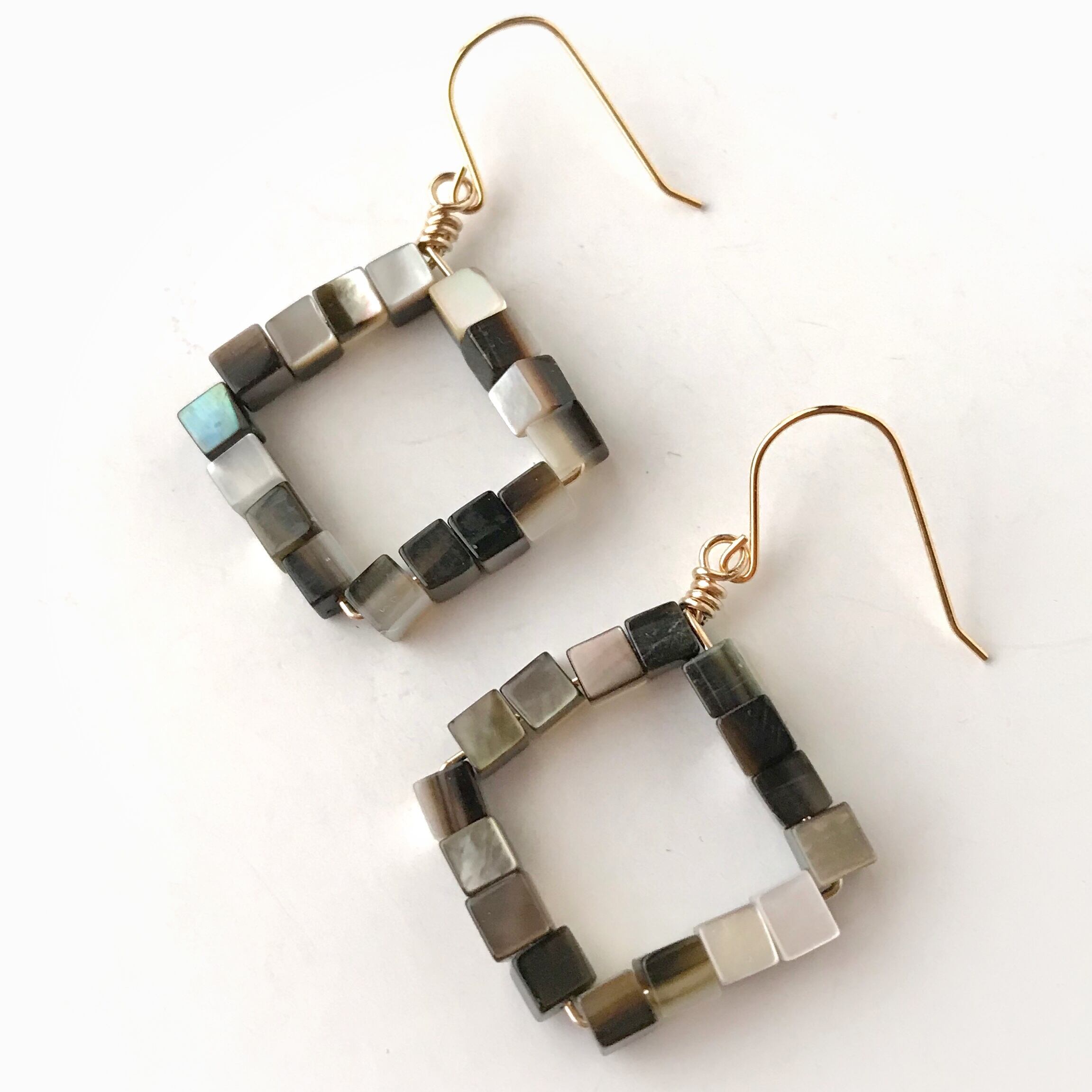 四角い黒蝶貝を四角く組み合わせて、大人のシックなピアスに仕上げました。