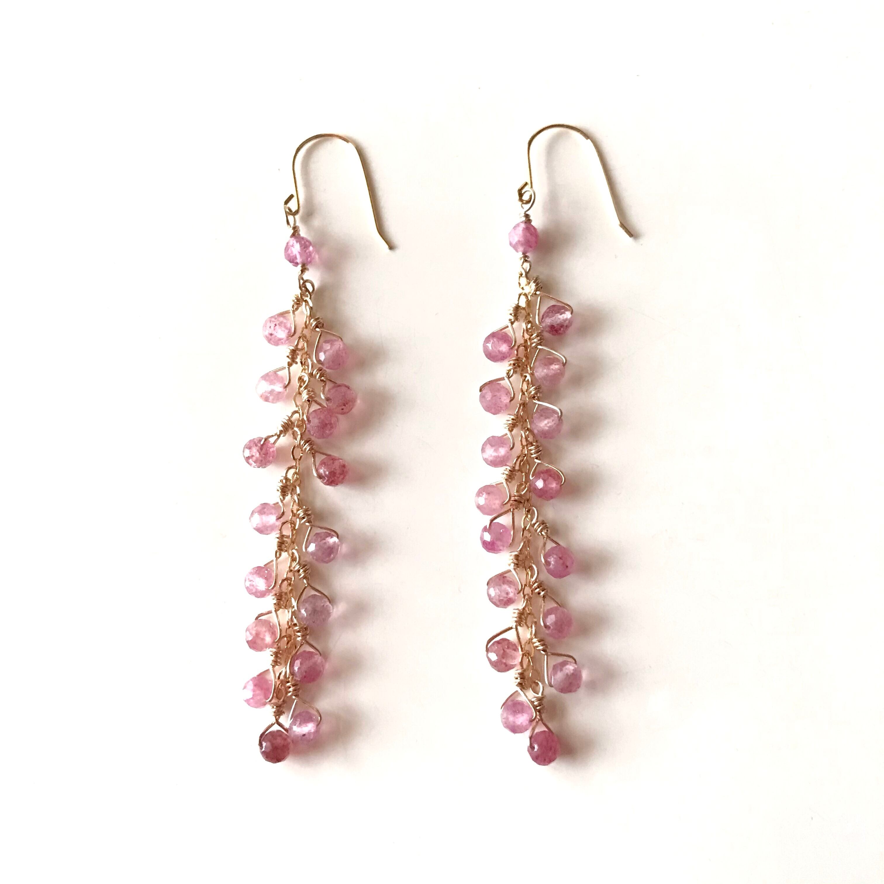 ピンクエピドートをいう天然石を使用しています。粒の大きさが3mmという小粒でも、透明のもの、半透明のもの、ダークピンクの模様が見えるものと、ひと粒ひと粒違う表情を見ることができます。
